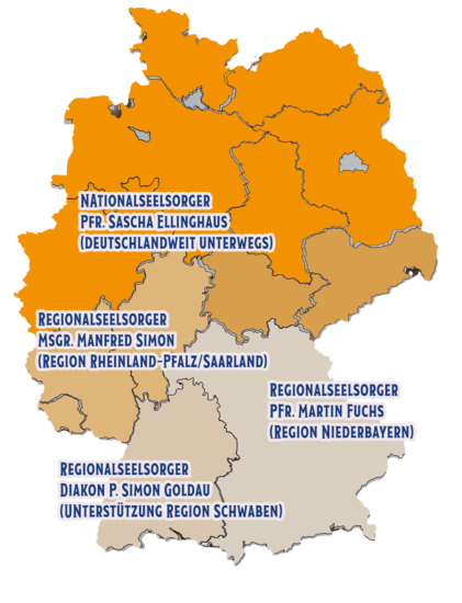 Seit dem Jahr 2002 unterstützen den Nationalseelsorger regionale Ansprechpartner in verschiedenen deutschen Bistümern, die in ihren Bereichen Kontakte zu Verbänden, Familien und Betrieben pflegen und die Sakramente im Circus und auf den Volksfesten spenden.